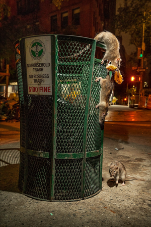 Left to right: Rats scavenging for food in a NYC garbage can, (Charlie Hamilton James/National Geographic); A rat roaming the sidewalks of manhattan on a rainy day (REUTERS/Carlo Allegri/File Photo); Rats spotted on subway tracks at the Union Square station (Michael Appleton/The New York Times);